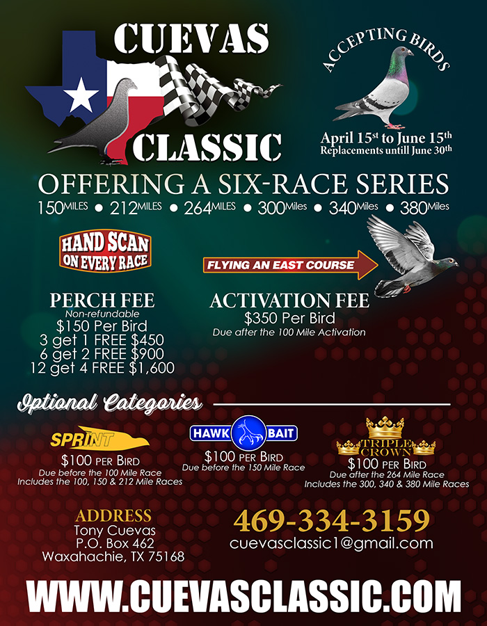 The Cuevas Classic is back for its 2026 season, promising more excitement, competition, and camaraderie, this is your chance to showcase the prowess of your pigeons on a national stage.