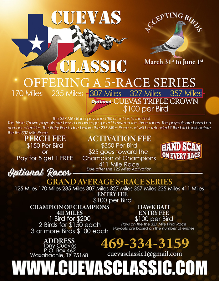 The Cuevas Classic is back for its 2025 season, promising more excitement, competition, and camaraderie, this is your chance to showcase the prowess of your pigeons on a national stage.